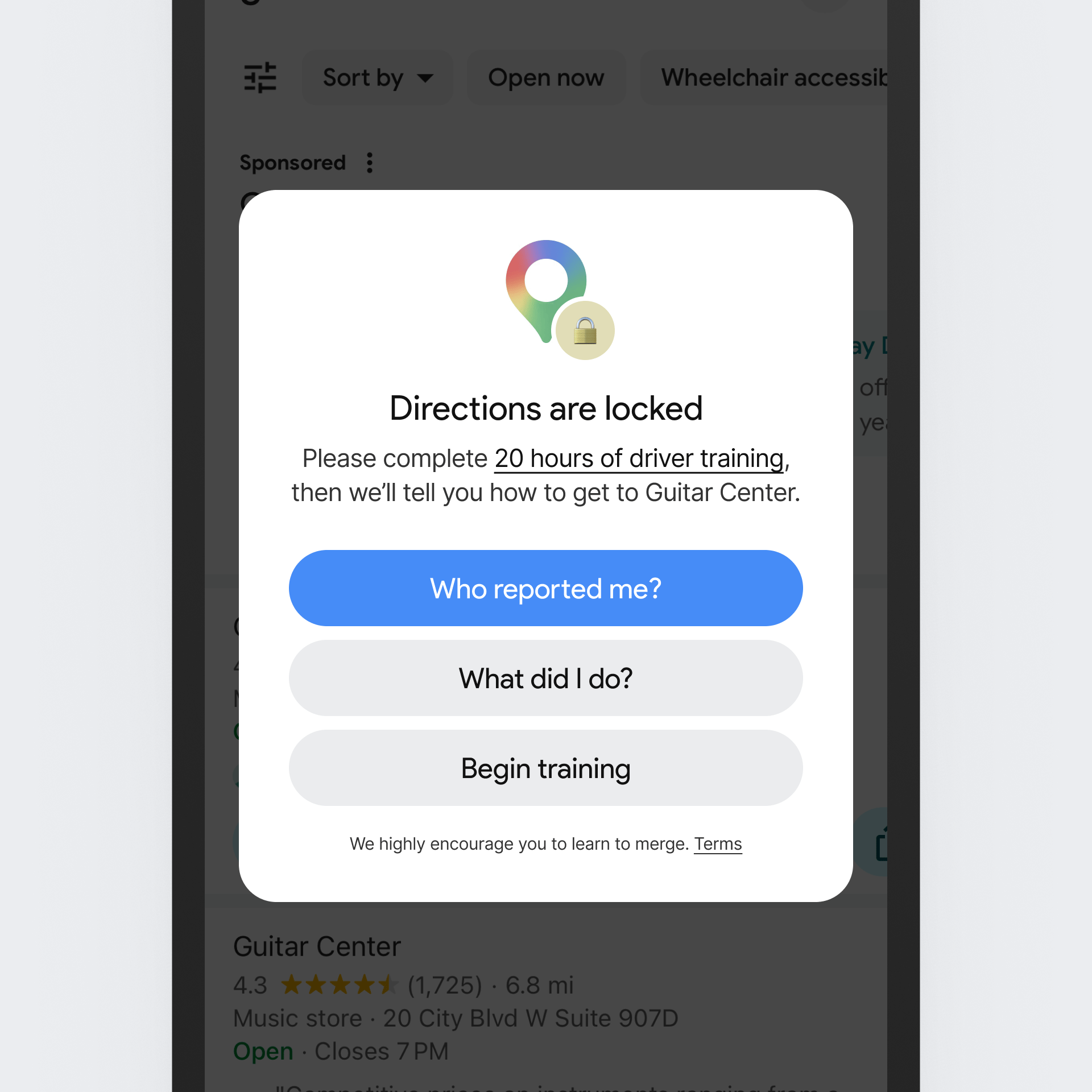This got me thinking… what if there were a way to penalize bad drivers within Google Maps? I imagine you could use a cars information to file a report and Google could tie it back if they have the right information to your account, and then ban you from getting directions until you complete driver training school.